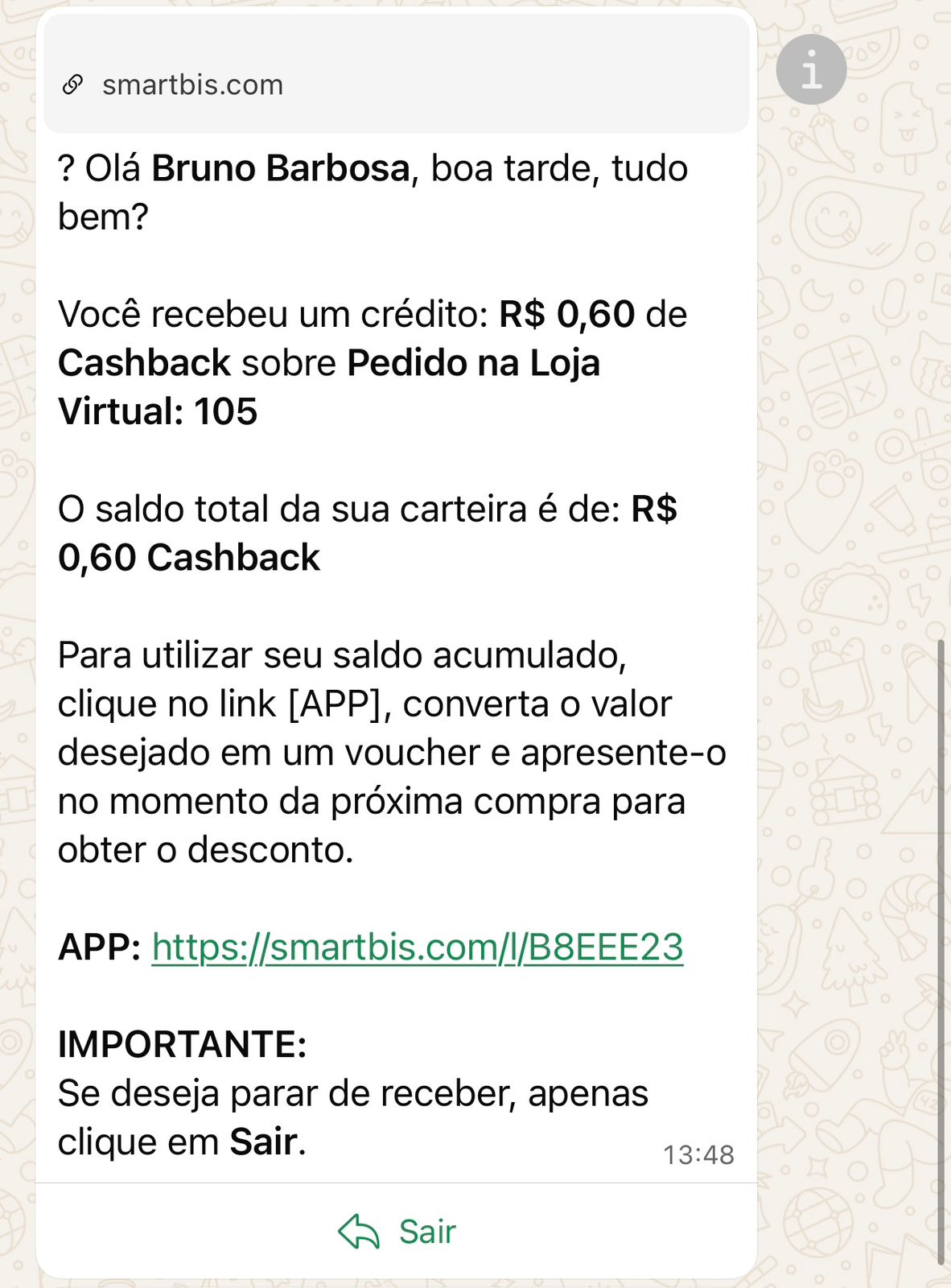 Após a confirmação da sua compra, você receberá uma mensagem pelo WhatsApp e também por e-mail informando o valor de cashback gerado naquele pedido. Nessa mensagem haverá um link de acesso ao nosso aplicativo.