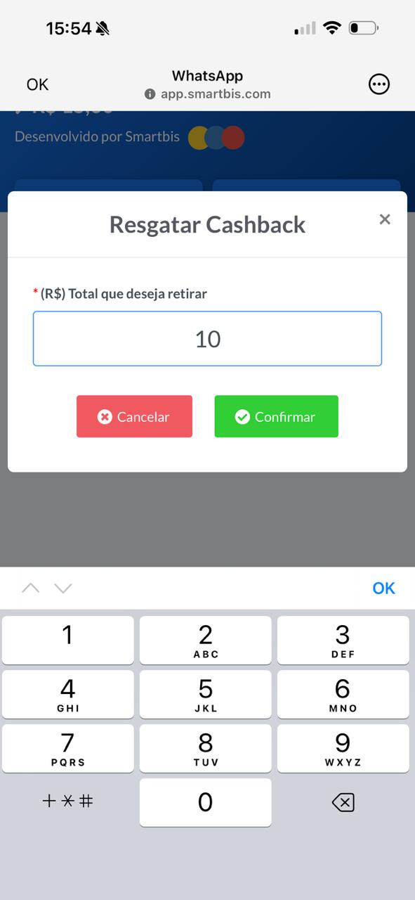 Para resgatar seu cashback, clique na opção Cashback. Será exibido um campo para você informar o valor que deseja resgatar. Você pode utilizar o valor total disponível ou escolher apenas uma parte. Após digitar o valor desejado, confirme a operação. Em seguida, aparecerá uma mensagem confirmando o resgate.