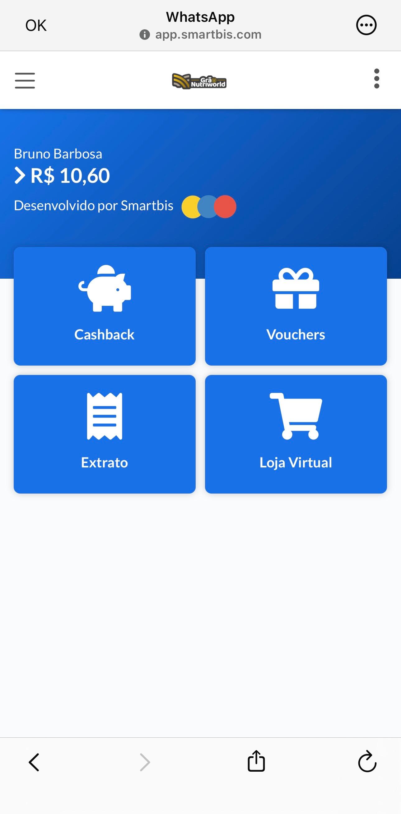 Ao clicar no link recebido, você será direcionado automaticamente para o aplicativo, já logado na sua conta. Não é necessário criar login ou senha. Nessa tela inicial você consegue visualizar o valor total do seu cashback acumulado, que pode ser somado ao longo de várias compras, além do extrato com todo o histórico de utilização.